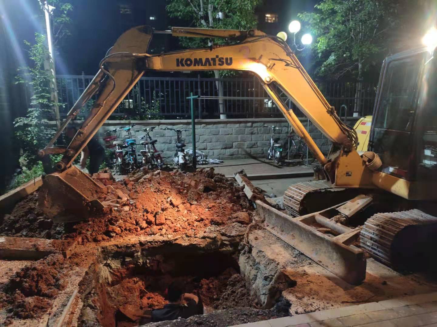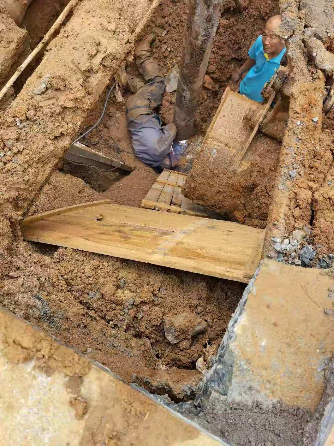 6月2日,挖掘机进入抢修现场,总务处主要负责人、分管领导亲临一线,指挥作战。水电管理和物业维修等部门工作人员携手配合,组织抢修。埋深挖土近百方后,找出进入东水场主管道,有两处明显破损漏水点,抢修人员下探到4米多深的坑内焊接漏点并对管道进行加固处理。抢修过程中,又发现该管道向北不远处管道破损,严重影响到正常供水。维修人员连夜抢修,深挖近6米,由于作业面狭窄,抢修人员数次钻进泥水混杂的管道沟内探寻管线路径,同时着手丈量、切割、熔管、焊接、固定……一系列工序紧张而有序。直至凌晨1点,对破裂水管封堵修复成功,恢复正常供水。