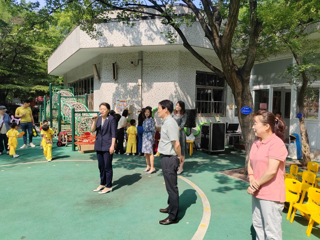 校领导观看了小朋友们表演的传统经典诵读及儿童“跳蚤市场”等活动,并与他们亲切互动。王邵军对幼儿园近年来取得的成绩给予了充分肯定,希望幼儿园注重文化的传承和教育方式的创新,确保孩子们健康快乐成长。同时强调:儿童是祖国的未来,是中华民族的希望,要真切关心、照顾好孩子们,要一切以孩子的健康、安全为重,注重做好安全工作,努力为其营造一个良好的学习和生活环境。